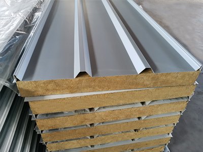 彩鋼巖棉板其上下表面采用鍍鋅彩色鋼板或鍍鋁鋅彩色鋼板,厚度為0.4-0.8mm。通過自動化連續成型機,經壓型后用高強粘合劑粘合而成。巖棉塊交錯鋪設,其纖維走向垂直于彩鋼巖棉夾芯板的上下表面,并緊密相接充實了彩鋼巖棉板的整個縱橫截面。巖棉塊之間和域名與上、下層鋼板之間通過高強度發泡劑粘接復合而成。彩鋼巖棉板有很強的剛度,具有防火、保溫、隔音等性能。